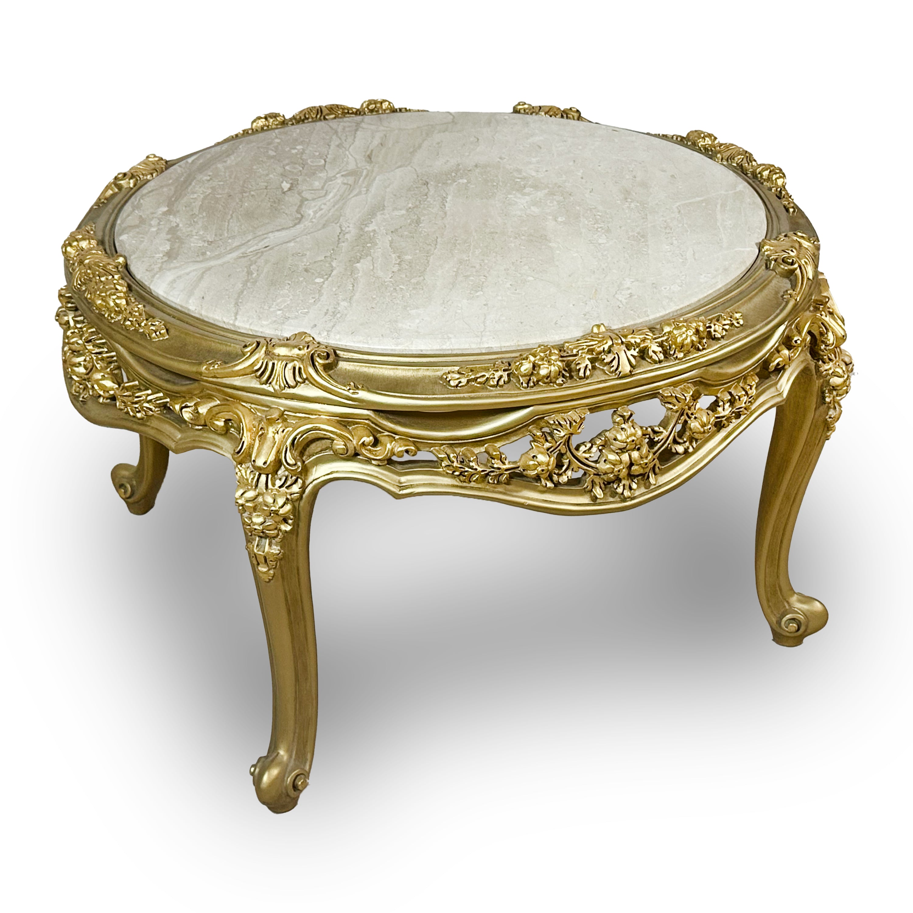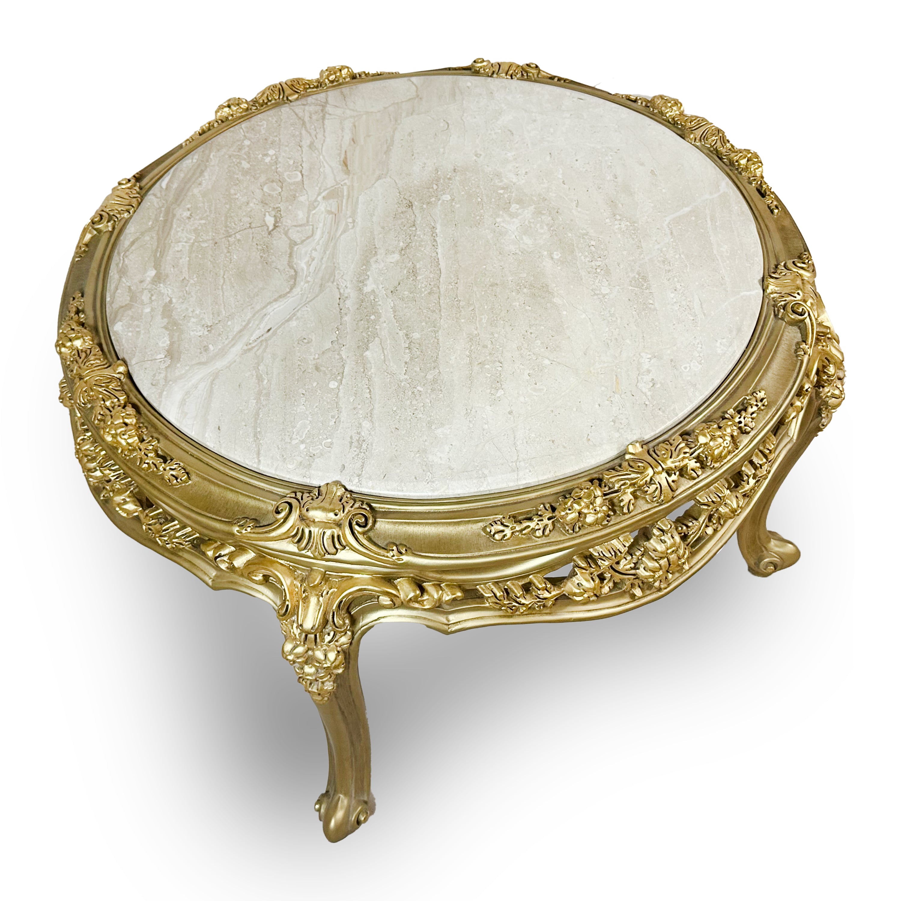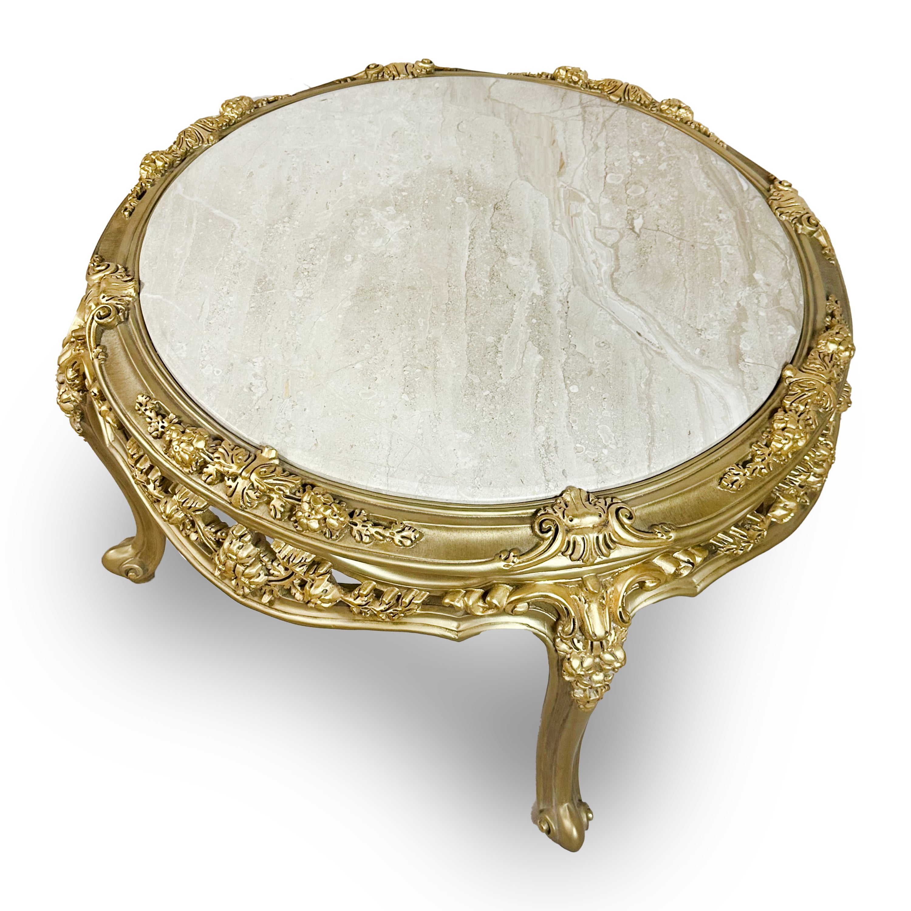 Antique Finish Hand Curved Round Coffe Table with Marble Top Gold Leaf