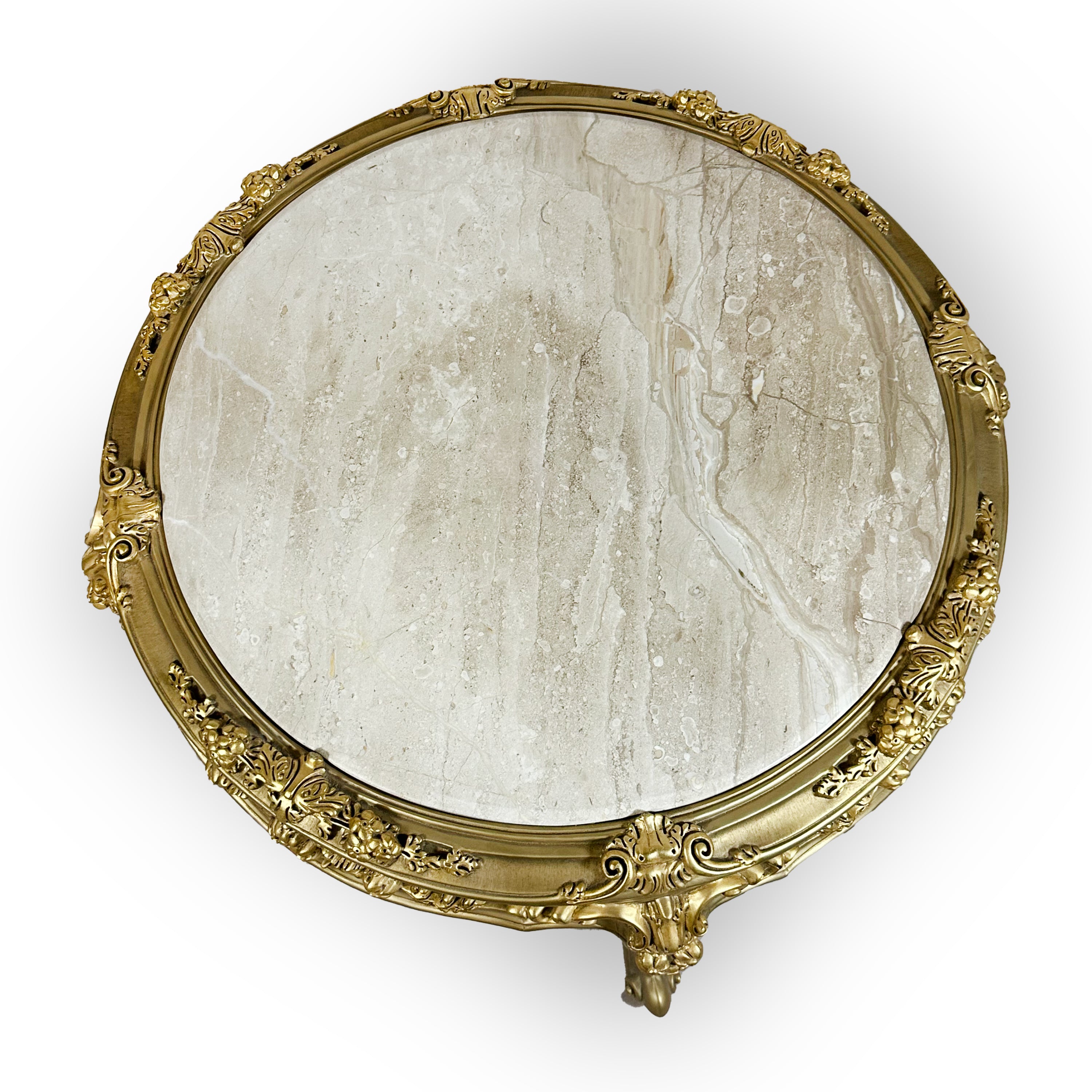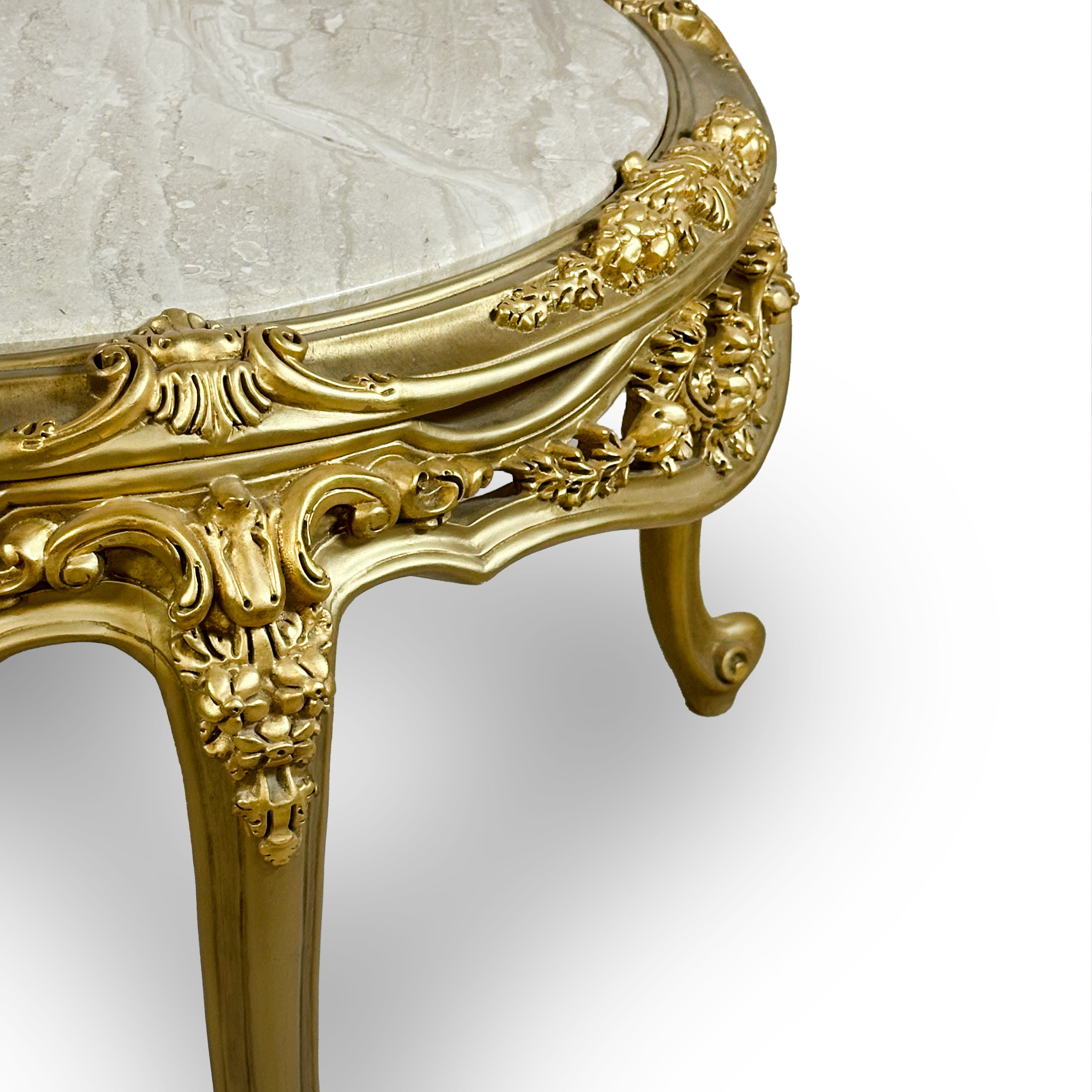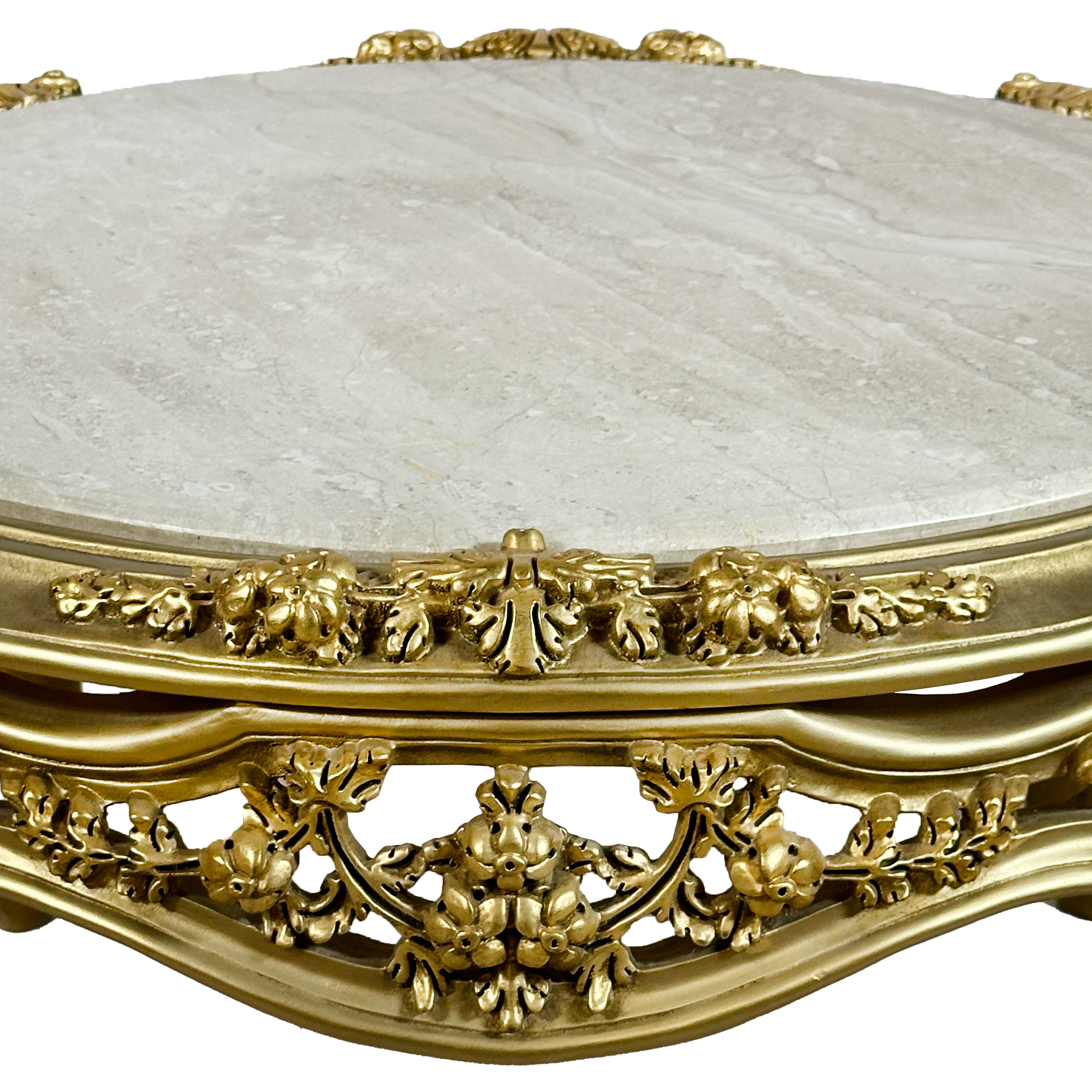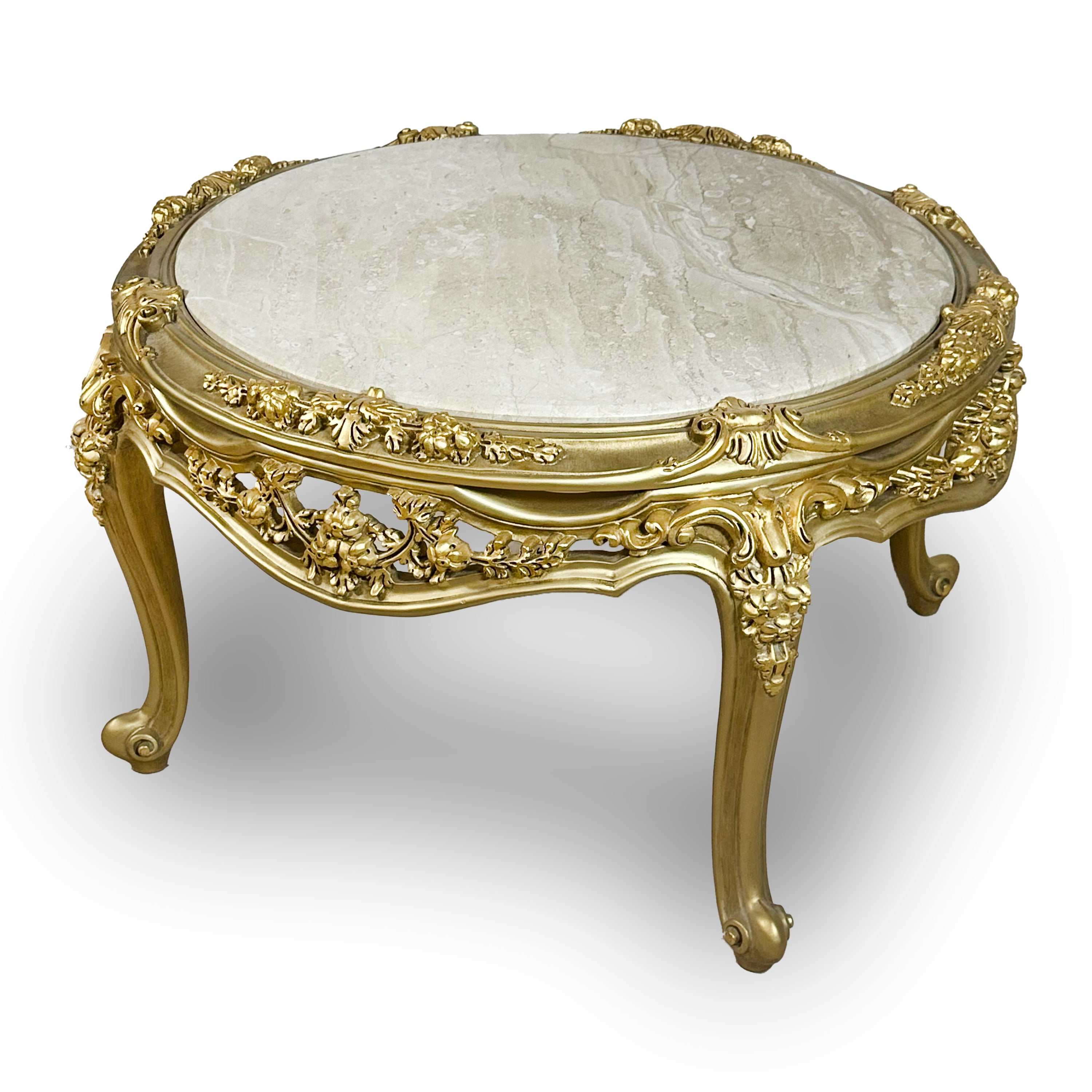 Antique Finish Hand Curved Round Coffe Table with Marble Top Gold Leaf